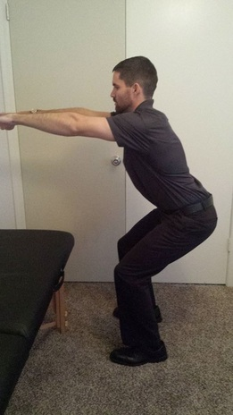 Begin by standing with your feet hip-width apart. Hold your arms out in front of you or fold them across your chest. Bend your knees slightly.